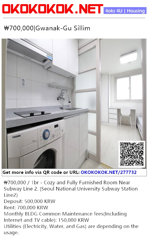 ₩700,000 / 1br - Cozy and Fully Furnished Room Near Subway Line 2. (Seoul National University Subway Station Line2)
