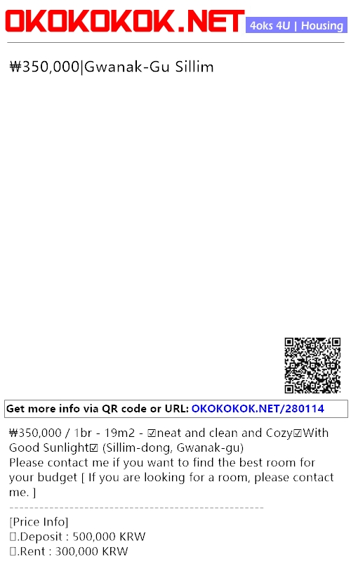 ₩350,000 / 1br - 19m2 - ☑neat and clean and Cozy☑With Good Sunlight☑ (Sillim-dong, Gwanak-gu)