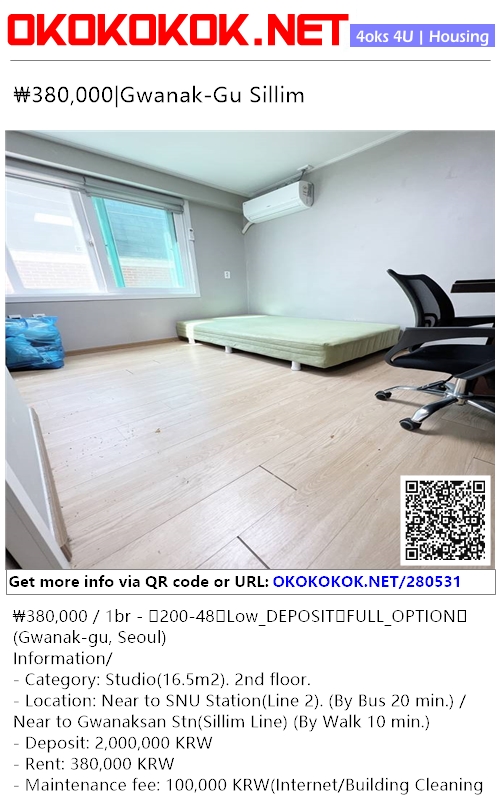 ₩380,000 / 1br - 🏠200-48🏠Low_DEPOSIT🏠FULL_OPTION🏠 (Gwanak-gu, Seoul)