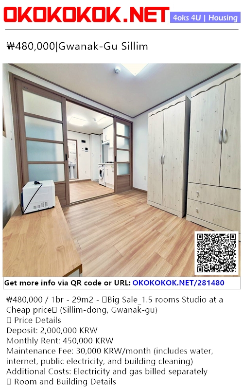 ₩480,000 / 1br - 29m2 - 💰Big Sale_1.5 rooms Studio at a Cheap price💰 (Sillim-dong, Gwanak-gu)