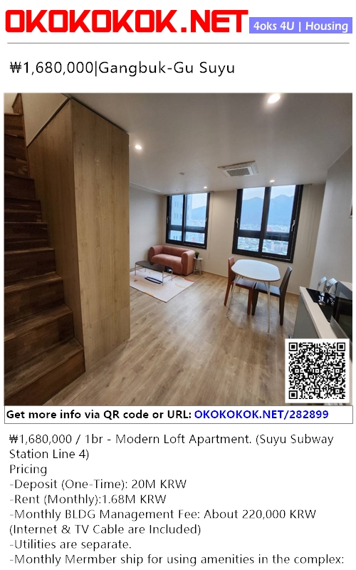 ₩1,680,000 / 1br - Modern Loft Apartment. (Suyu Subway Station Line 4)