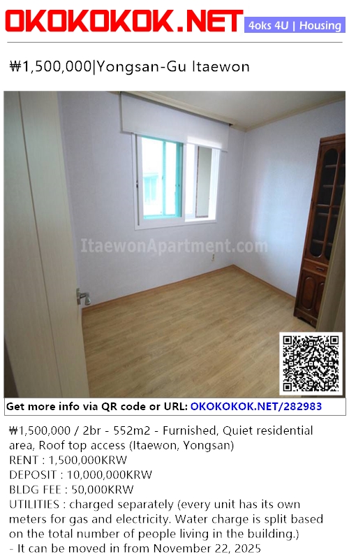 ₩1,500,000 / 2br - 552m2 - Furnished, Quiet residential area, Roof top access (Itaewon, Yongsan)