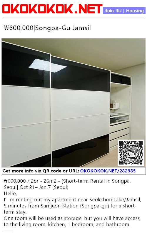₩600,000 / 2br - 26m2 - [Short-term Rental in Songpa, Seoul] Oct 21– Jan 7 (Seoul)