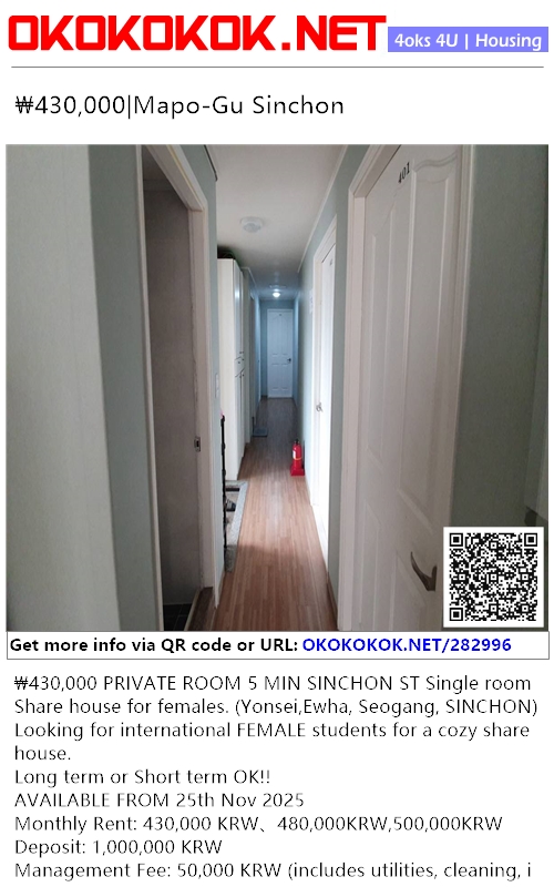 ₩430,000 PRIVATE ROOM 5 MIN SINCHON ST Single room Share house for females. (Yonsei,Ewha, Seogang, SINCHON)