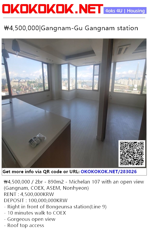 ₩4,500,000 / 2br - 890m2 - Michelan 107 with an open view (Gangnam, COEX, ASEM, Nonhyeon) RENT : 4,...