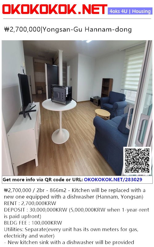 ₩2,700,000 / 2br - 866m2 - Kitchen will be replaced with a new one equipped with a dishwasher (Hannam, Yongsan)