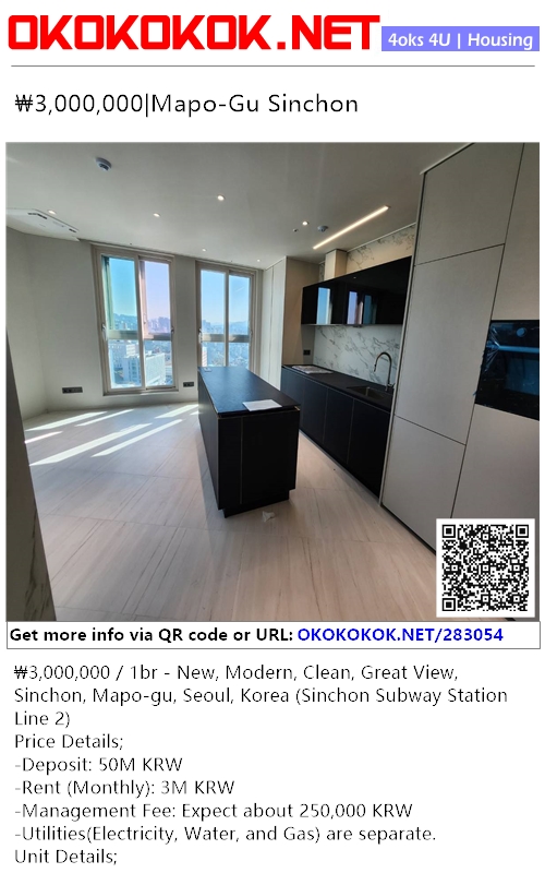 ₩3,000,000 / 1br - New, Modern, Clean, Great View, Sinchon, Mapo-gu, Seoul, Korea (Sinchon Subway Station Line 2)