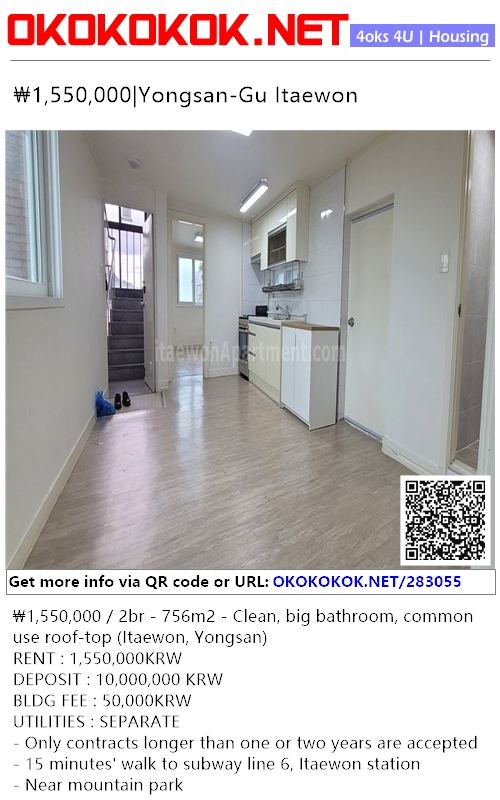 ₩1,550,000 / 2br - 756m2 - Clean, big bathroom, common use roof-top (Itaewon, Yongsan)