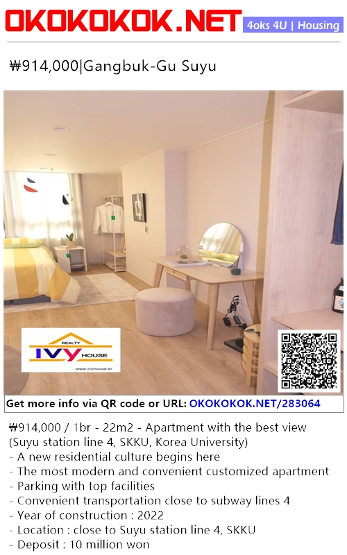 ₩914,000 / 1br - 22m2 - Apartment with the best view (Suyu station line 4, SKKU, Korea University)