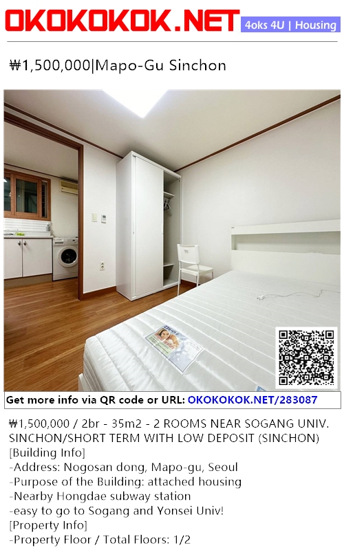 ₩1,500,000 / 2br - 35m2 - 2 ROOMS NEAR SOGANG UNIV. SINCHON/SHORT TERM WITH LOW DEPOSIT (SINCHON)
