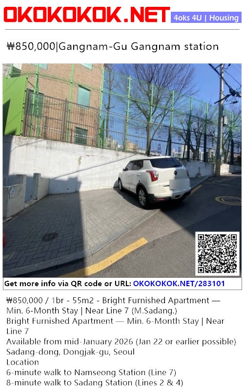 ₩850,000 / 1br - 55m2 - Bright Furnished Apartment — Min. 6-Month Stay | Near Line 7 (M.Sadang.)