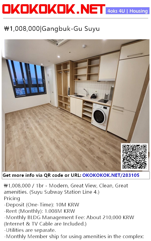 ₩1,008,000 / 1br - Modern, Great View, Clean, Great amenities. (Suyu Subway Station Line 4.)