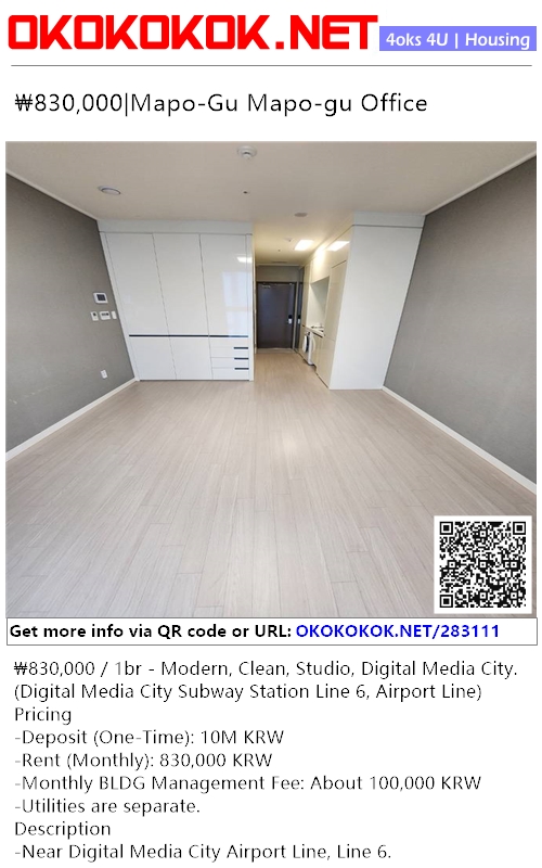 ₩830,000 / 1br - Modern, Clean, Studio, Digital Media City. (Digital Media City Subway Station Line 6, Airport Line)