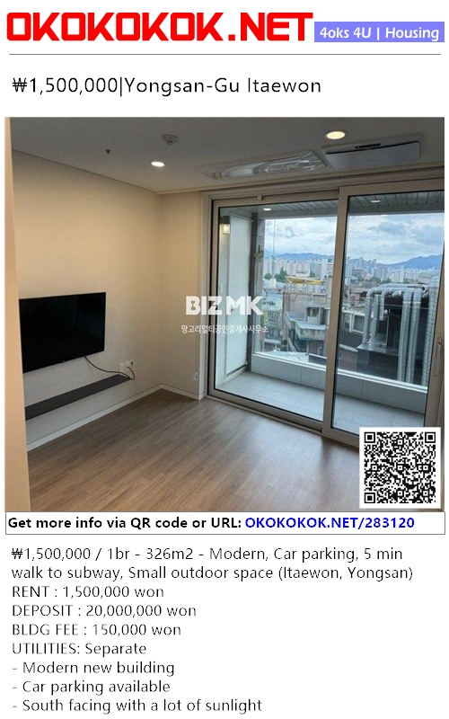 ₩1,500,000 / 1br - 326m2 - Modern, Car parking, 5 min walk to subway, Small outdoor space (Itaewon, Yongsan)