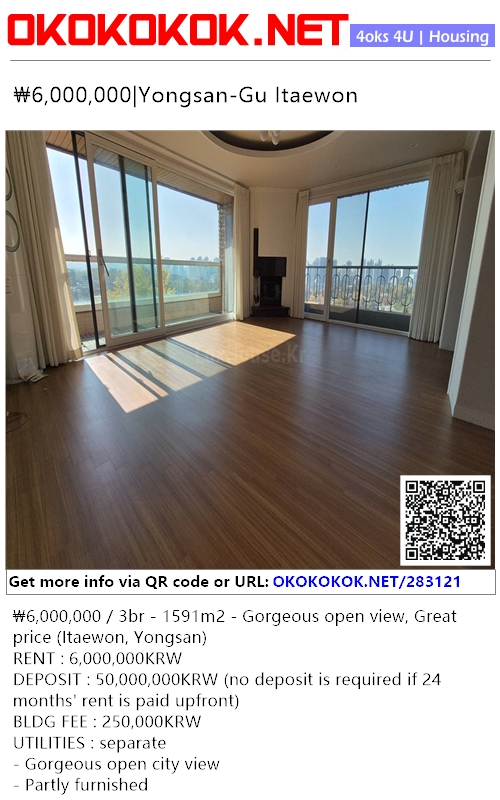 ₩6,000,000 / 3br - 1591m2 - Gorgeous open view, Great price (Itaewon, Yongsan)