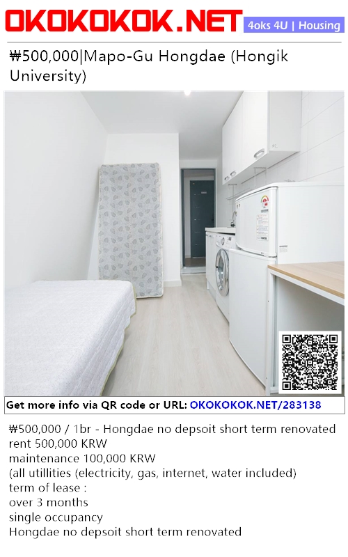 ₩500,000 / 1br - Hongdae no depsoit short term renovated rent 500,000 KRW maintenance 100,000 KRW (...