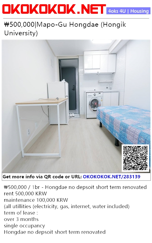 ₩500,000 / 1br - Hongdae no depsoit short term renovated rent 500,000 KRW maintenance 100,000 KRW (...