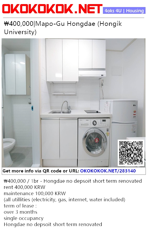 ₩400,000 / 1br - Hongdae no depsoit short term renovated rent 400,000 KRW maintenance 100,000 KRW (...