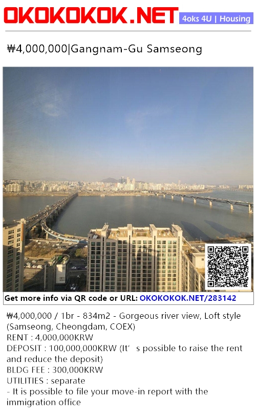 ₩4,000,000 / 1br - 834m2 - Gorgeous river view, Loft style (Samseong, Cheongdam, COEX)