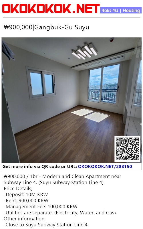 ₩900,000 / 1br - Modern and Clean Apartment near Subway Line 4. (Suyu Subway Station Line 4)