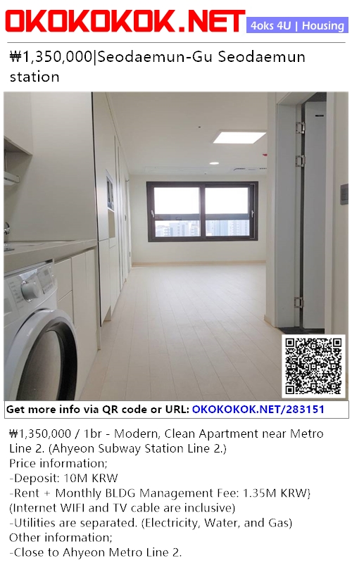 ₩1,350,000 / 1br - Modern, Clean Apartment near Metro Line 2. (Ahyeon Subway Station Line 2.)