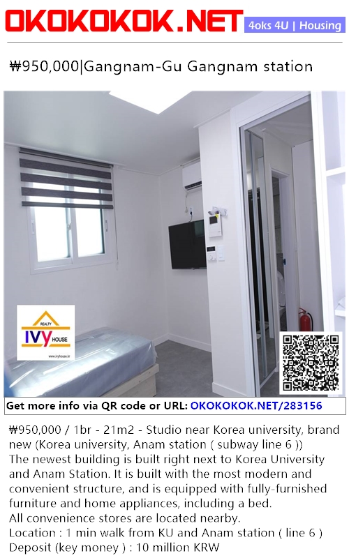 The newest building is built right next to Korea University and Anam Station. It is built with the most modern and convenient structure, and is equipped with fully-furnished furniture and home appliances, including a bed.