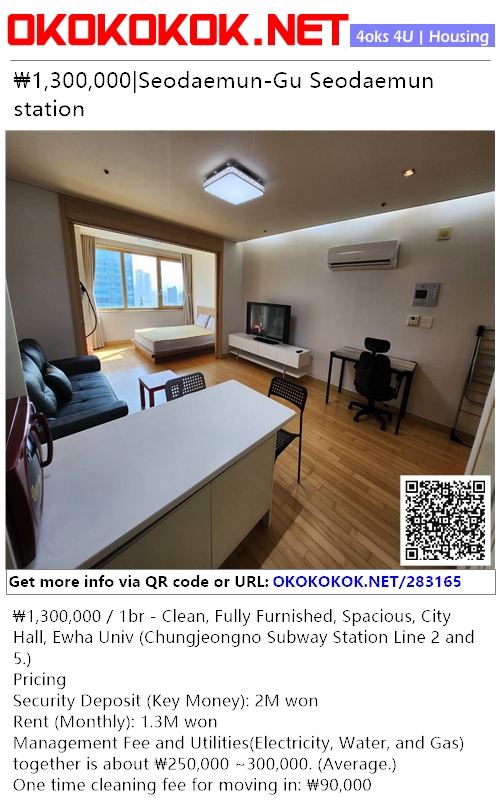 ₩1,300,000 / 1br - Clean, Fully Furnished, Spacious, City Hall, Ewha Univ (Chungjeongno Subway Station Line 2 and 5.)