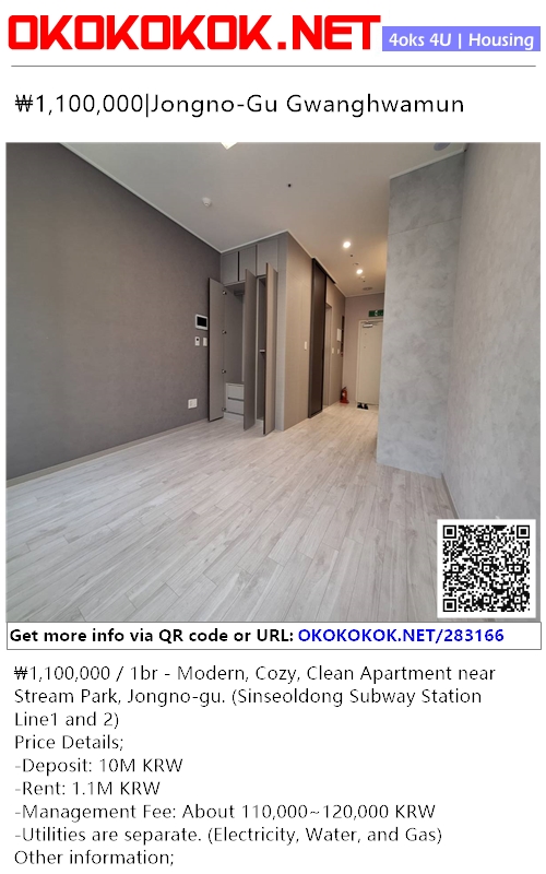 ₩1,100,000 / 1br - Modern, Cozy, Clean Apartment near Stream Park, Jongno-gu. (Sinseoldong Subway Station Line1 and 2)