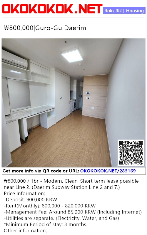 ₩800,000 / 1br - Modern, Clean, Short term lease possible near Line 2. (Daerim Subway Station Line 2 and 7.)
