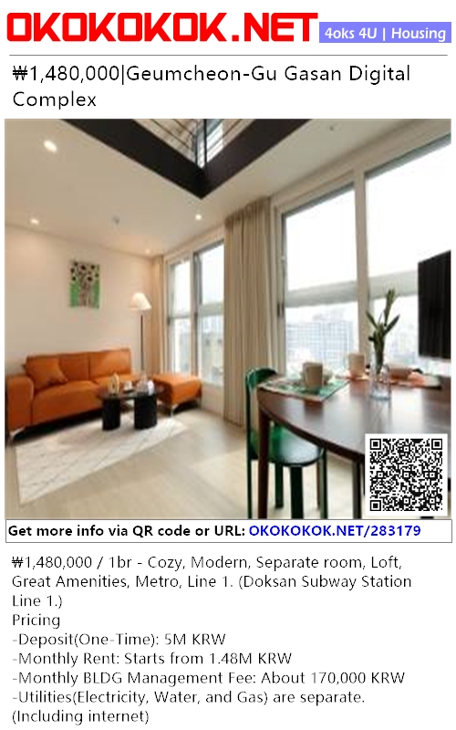 ₩1,480,000 / 1br - Cozy, Modern, Separate room, Loft, Great Amenities, Metro, Line 1. (Doksan Subway Station Line 1.)