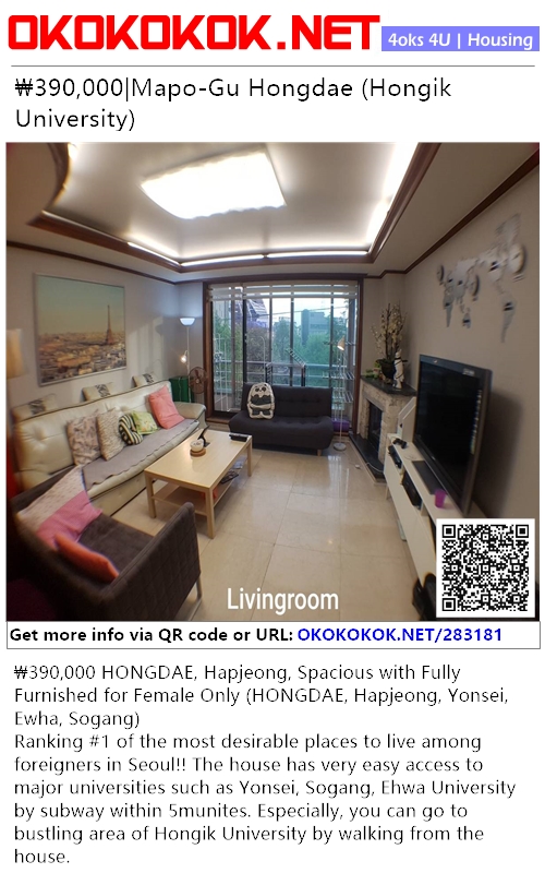 ₩390,000 HONGDAE, Hapjeong, Spacious with Fully Furnished for Female Only (HONGDAE, Hapjeong, Yonsei, Ewha, Sogang)