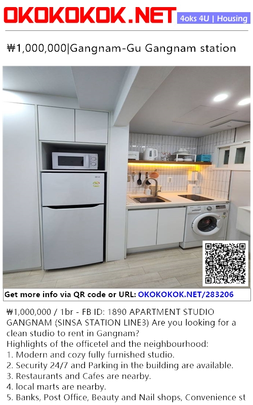 ₩1,000,000 / 1br - FB ID: 1890 APARTMENT STUDIO GANGNAM (SINSA STATION LINE3) Are you looking for a clean studio to rent in Gangnam?