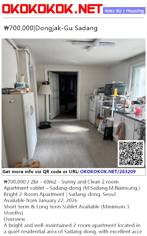 ₩700,000 / 2br - 60m2 - Sunny and Clean 2 room Apartment sublet – Sadang-dong (M.Sadang.M.Namsung.)