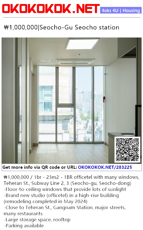 ₩1,000,000 / 1br - 23m2 - 1BR officetel with many windows, Teheran St., Subway Line 2, 3 (Seocho-gu, Seocho-dong)