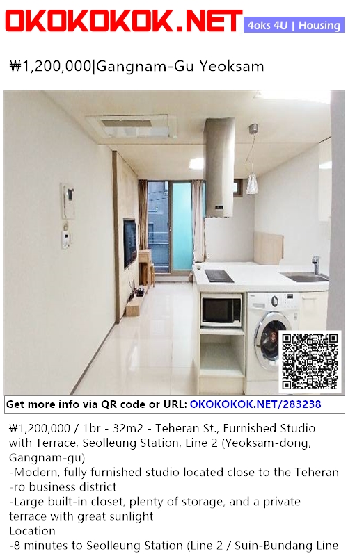 ₩1,200,000 / 1br - 32m2 - Teheran St., Furnished Studio with Terrace, Seolleung Station, Line 2 (Yeoksam-dong, Gangnam-gu)