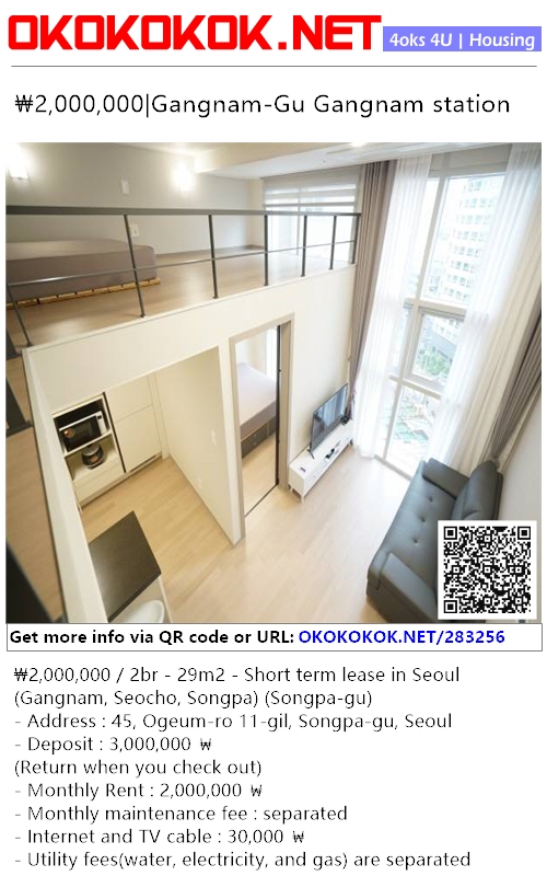 ₩2,000,000 / 2br - 29m2 - Short term lease in Seoul(Gangnam, Seocho, Songpa) (Songpa-gu)