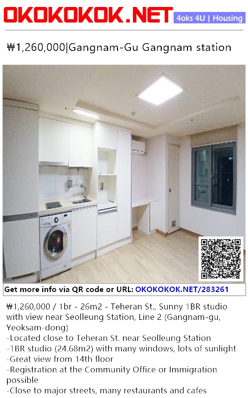 ₩1,260,000 / 1br - 26m2 - Teheran St., Sunny 1BR studio with view near Seolleung Station, Line 2 (Gangnam-gu, Yeoksam-dong)