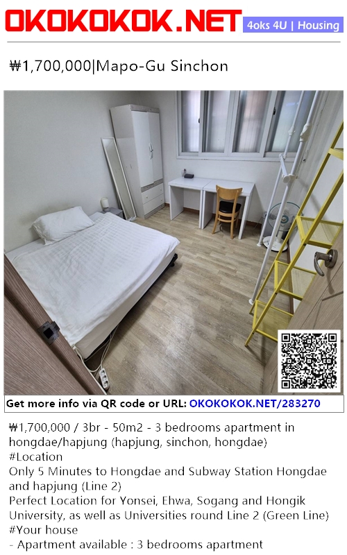 ₩1,700,000 / 3br - 50m2 - 3 bedrooms apartment in hongdae/hapjung (hapjung, sinchon, hongdae)