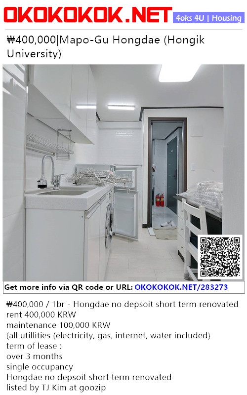 ₩400,000 / 1br - Hongdae no depsoit short term renovated