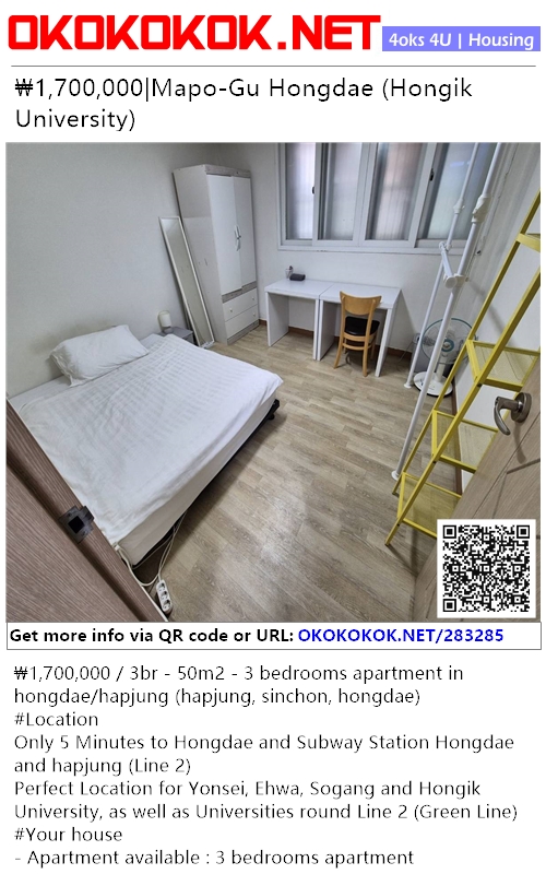 ₩1,700,000 / 3br - 50m2 - 3 bedrooms apartment in hongdae/hapjung (hapjung, sinchon, hongdae)