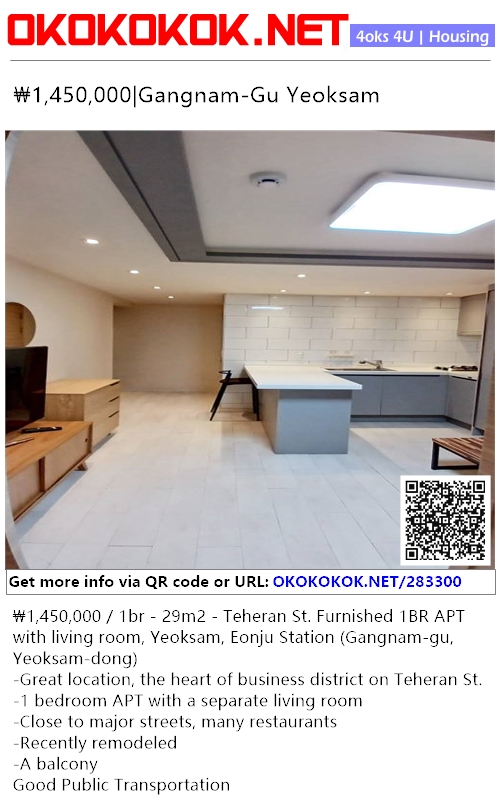 ₩1,450,000 / 1br - 29m2 - Teheran St. Furnished 1BR APT with living room, Yeoksam, Eonju Station (Gangnam-gu, Yeoksam-dong)