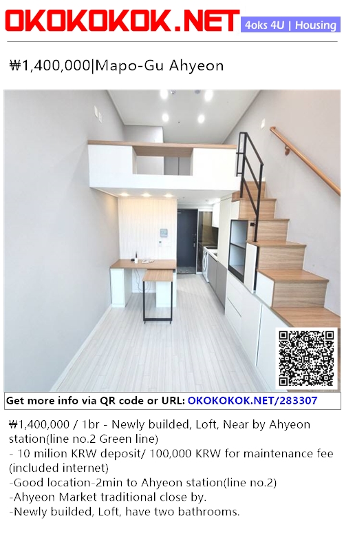 ₩1,400,000 / 1br - Newly builded, Loft, Near by Ahyeon station(line no.2 Green line)