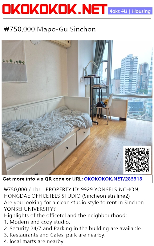 ₩750,000 / 1br - PROPERTY ID: 9929 YONSEI SINCHON, HONGDAE OFFICETELS STUDIO (Sincheon stn line2)
