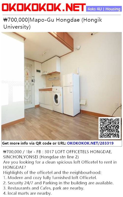 ₩700,000 / 1br - FB : 3017 LOFT OFFICETELS HONGDAE, SINCHON,YONSEI (Hongdae stn line 2)