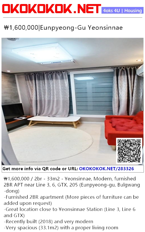 ₩1,600,000 / 2br - 33m2 - Yeonsinnae, Modern, furnished 2BR APT near Line 3, 6, GTX, 205 (Eunpyeong-gu, Bulgwang-dong)