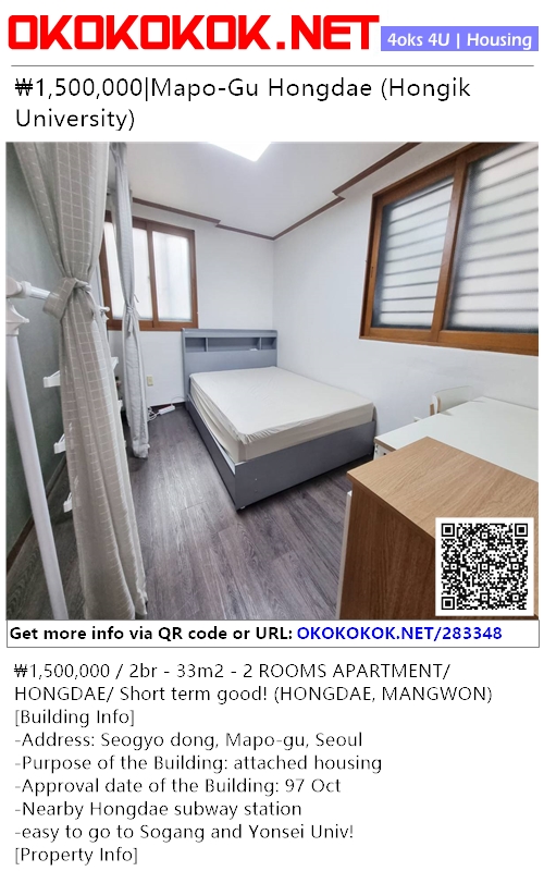 ₩1,500,000 / 2br - 33m2 - 2 ROOMS APARTMENT/ HONGDAE/ Short term good! (HONGDAE, MANGWON)