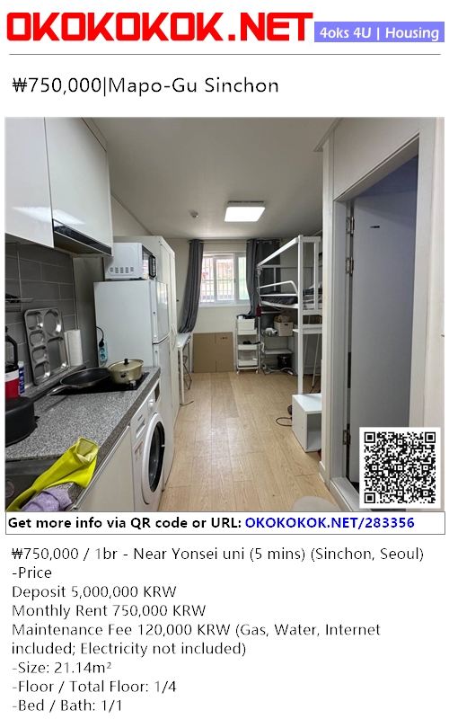 ₩750,000 / 1br - Near Yonsei uni (5 mins) (Sinchon, Seoul)