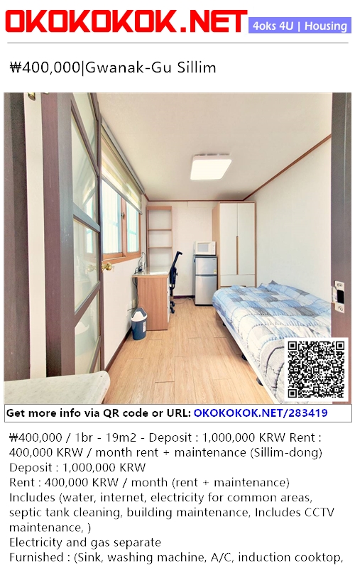 ₩400,000 / 1br - 19m2 - Deposit : 1,000,000 KRW Rent : 400,000 KRW / month rent + maintenance (Sillim-dong)