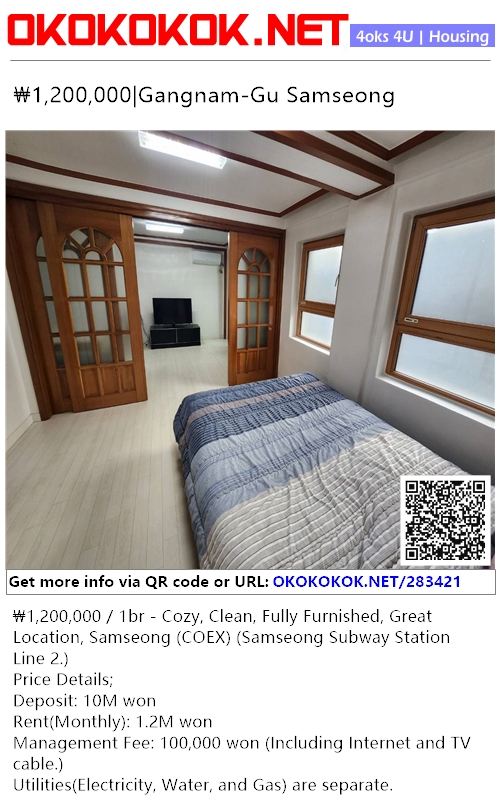 ₩1,200,000 / 1br - Cozy, Clean, Fully Furnished, Great Location, Samseong (COEX) (Samseong Subway Station Line 2.)