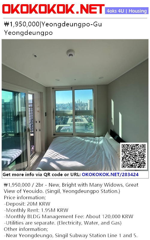₩1,950,000 / 2br - New, Bright with Many Widows, Great View of Yeouido. (Singil, Yeongdeungpo Station.)